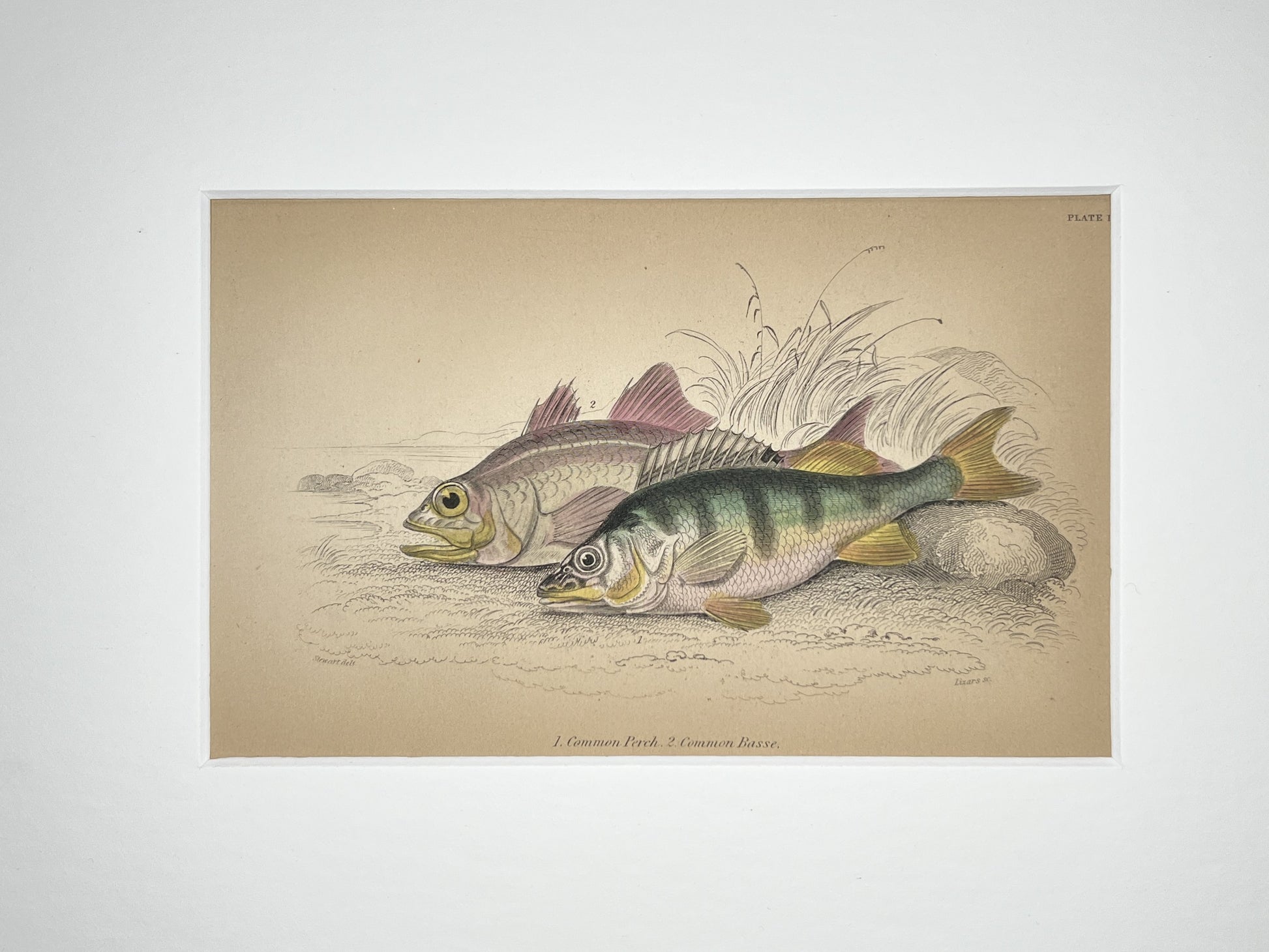 Offered for sale is an antique hand-colored engraving from Ichthyology, British Fishes, Part I edited by Sir William Jardine and published between 1841 and 1843. Each engraving is approximately 4” by 6” and comes matted and mounted on acid free archival materials.