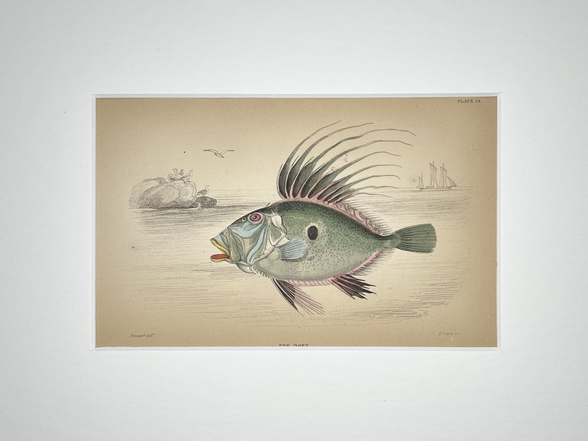 Offered for sale is an antique hand-colored engraving from Ichthyology, British Fishes, Part I edited by Sir William Jardine and published between 1841 and 1843. Each engraving is approximately 4” by 6” and comes matted and mounted on acid free archival materials.