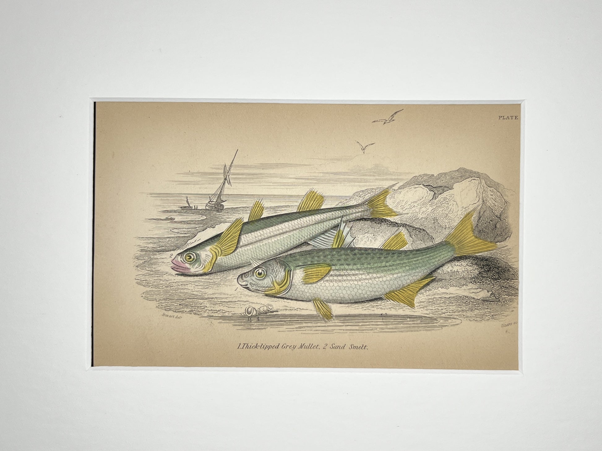 Offered for sale is an antique hand-colored engraving from Ichthyology, British Fishes, Part I edited by Sir William Jardine and published between 1841 and 1843. Each engraving is approximately 4” by 6” and comes matted and mounted on acid free archival materials.